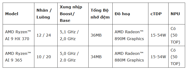 | AMD Ryzen™ AI 9 HX 370 | 12 / 24 | 5,1 GHz / 2,0 GHz | 36MB | AMD Radeon™ 890M Graphics | 15-54W | Có (50 TOP) |