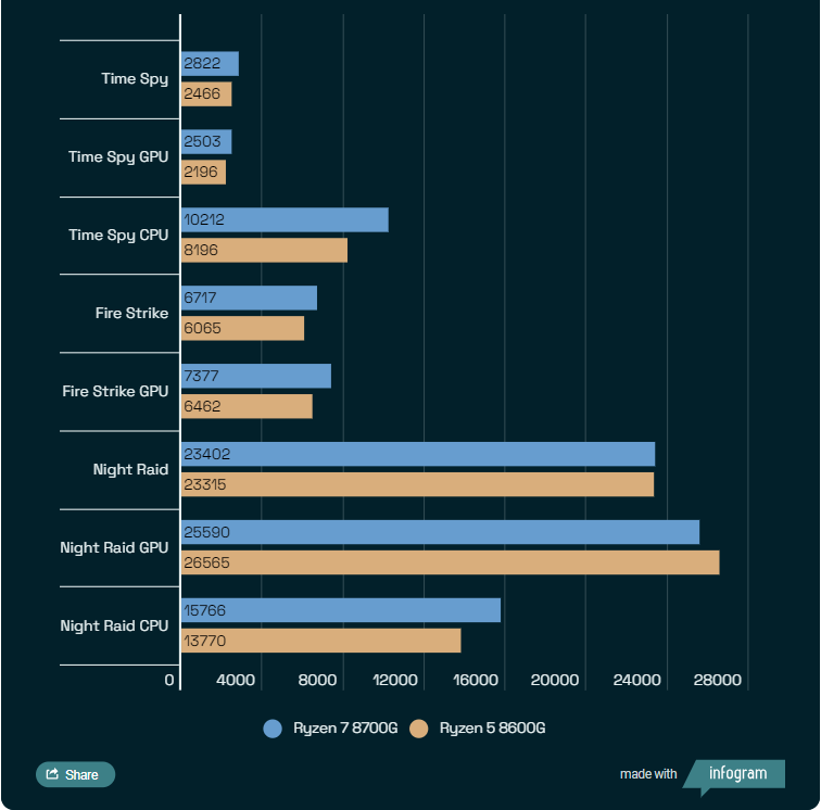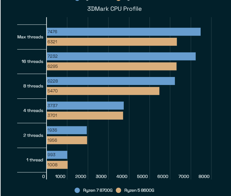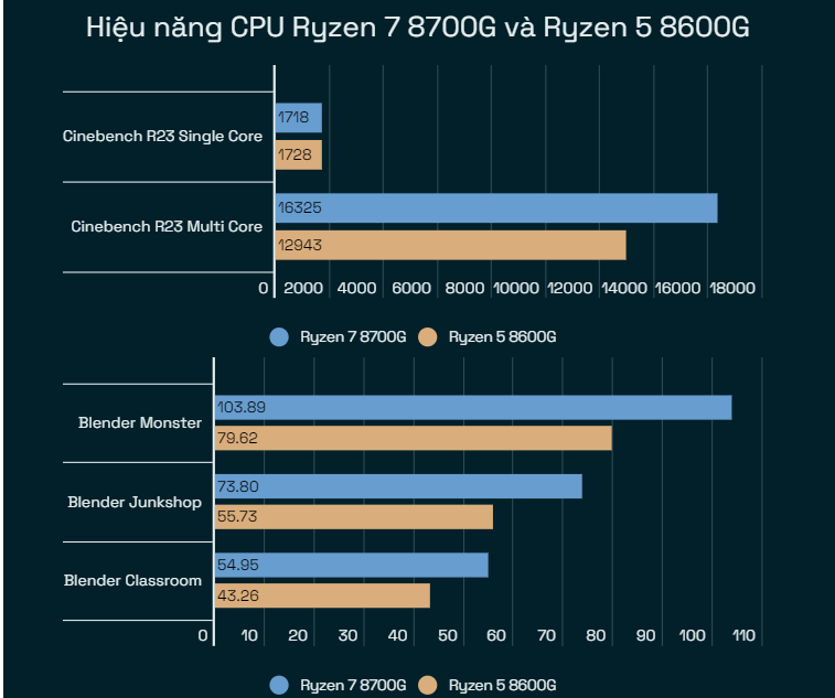 Ở một khía cạnh khác, với bài thử nghiệm Cinebench R23, hiệu năng đa nhân CPU của Ryzen 7 8700G và Ryzen 5 8600G chênh khoảng 15% so với kiến trúc và sản phẩm chip cũ, 5700G và 5600G. Tuy nhiên, nếu so sánh trực tiếp với hai sản phẩm cùng thế hệ kiến trúc CPU, Ryzen 7 7700 và Ryzen 5 7600, hiệu năng đa nhân CPU của hai chip APU thấp hơn khoảng 12%, có lẽ vì áp lực nhiệt độ tạo ra khi cả CPU lẫn iGPU khá mạnh cùng vận hành.