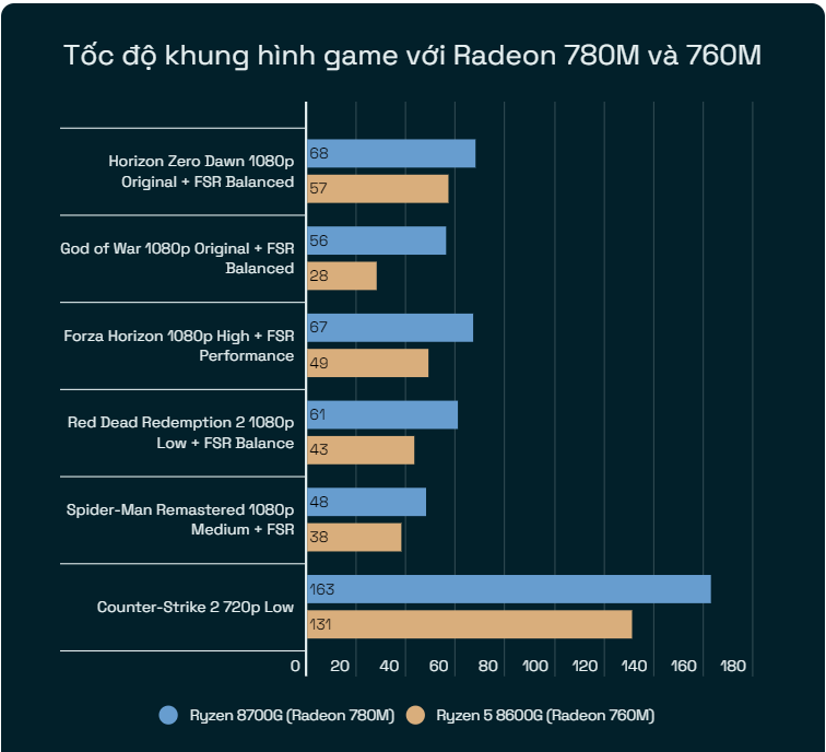Kết quả là, nếu như Ryzen 5 8600G đủ sức chơi game ở độ phân giải 1080p mượt với tốc độ khung hình 60 FPS, trong trường hợp hạ hết chất lượng và tùy chọn đồ họa xuống mức thấp nhất, thì Ryzen 7 8700G có thể tạo ra trải nghiệm chơi game đẹp hơn một chút, ở chất lượng đồ họa trung bình cao, kết hợp với thuật toán tăng độ phân giải hình ảnh game mang tên FSR do AMD phát triển.