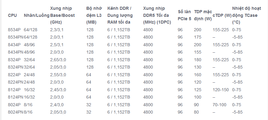 Danh sách vi xử lý thuộc AMD EPYC 8004 Series: